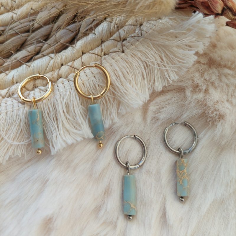 Natuursteen oorbellen – 304-RVS creool met Natuursteen – Blauw in cilindervorm