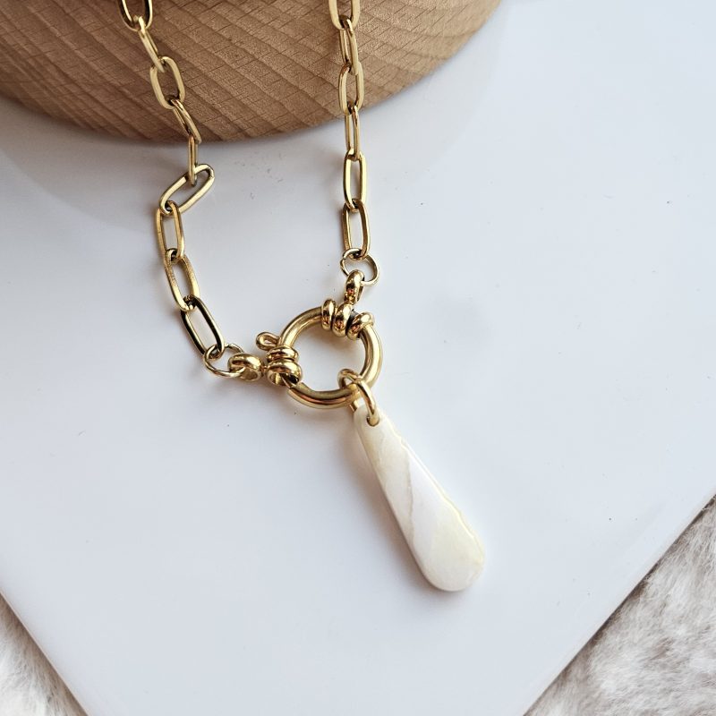 Deze mooie gebroken witte bedel van polymeerklei past perfect aan onze schakelkettingen. Je koopt één ketting (en misschien wel) meerdere bedels om elke dag weer een andere look te creëren. De ring kan in zilver- of goudkleurig RVS en is makkelijk te bevestigen aan de ketting. LET OP! Dit product betreft alleen de bedel, de bedelketting kan je er los bij kopen.